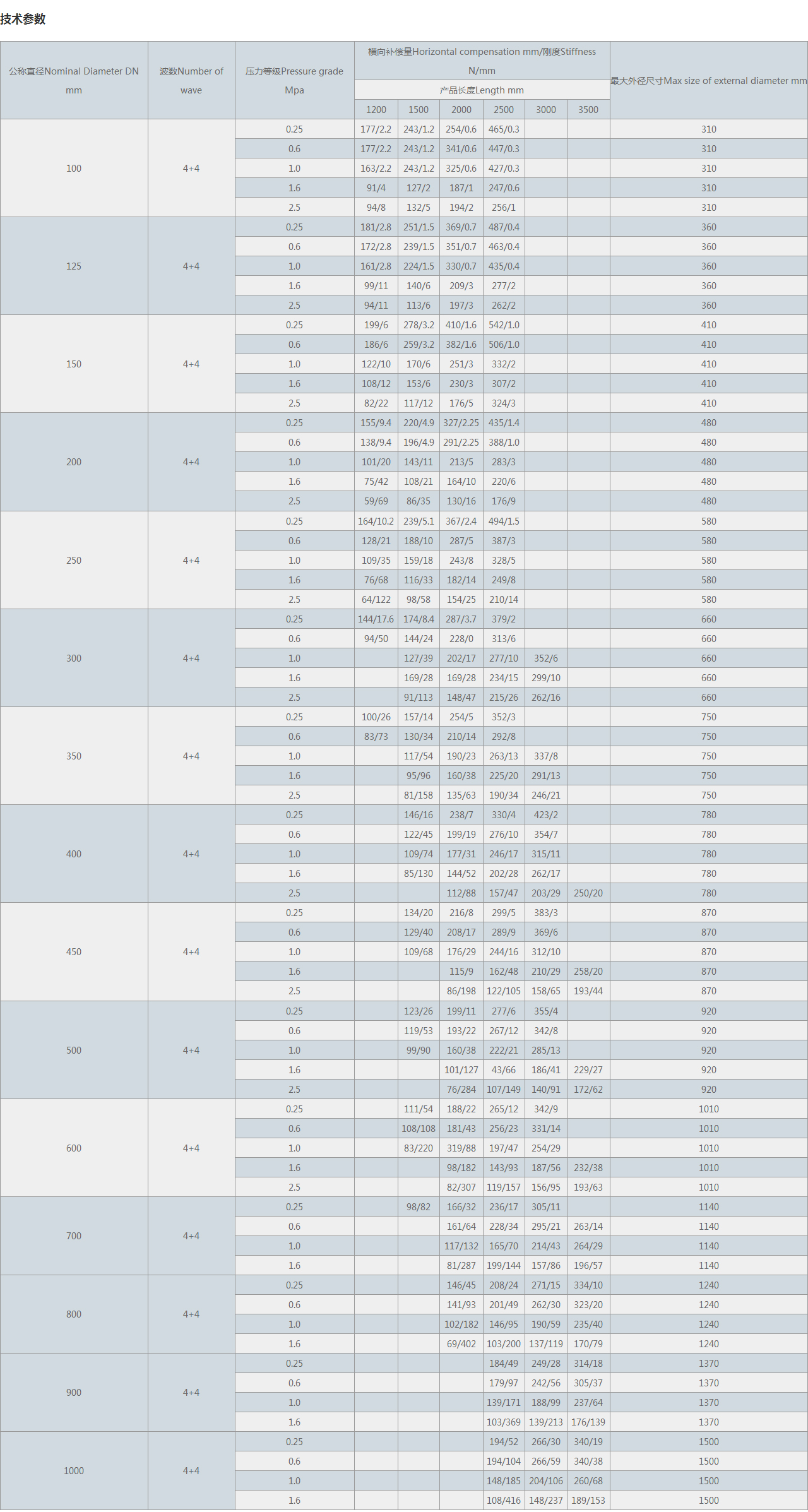| 公稱直徑Nominal Diameter DN mm | 波數(shù)Number of wave | 壓力等級(jí)Pressure grade Mpa | 橫向補(bǔ)償量Horizontal compensation mm/剛度Stiffness N/mm | 很大外徑尺寸Max size of external diameter mm | |||||