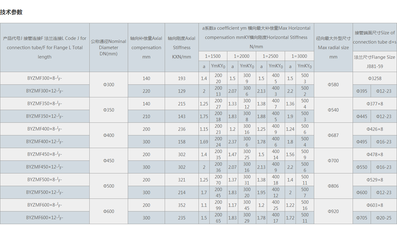 軸向補(bǔ)償量Axial compensation mm | 軸向剛度Axial Stiffness KXN/mm | a系數(shù)a coefficient ym 橫向很大補(bǔ)償量Max Horizontal compensation mmKY橫向剛度Horizontal Stiffness N/mm | 徑向很大外型尺寸Max radial size mm | 接管端面尺寸Size of connection tube d×s | ||||||||