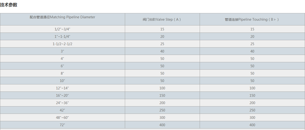 | 配合管道通徑Matching Pipeline Diameter | 閥門臺階Valve Step(A) | 管道連接Pipeline Touching(B>) |