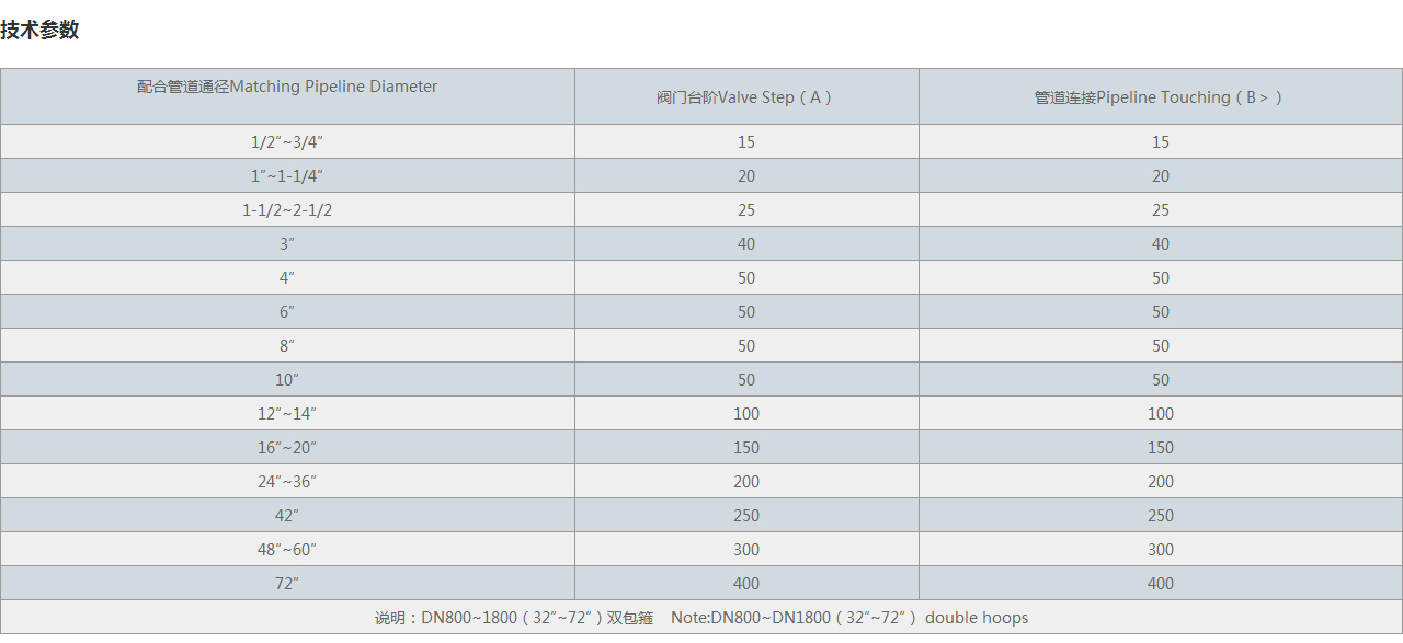| 說(shuō)明:DN800~1800(32″~72″)雙包箍 Note:DN800~DN1800(32″~72″) double hoops | ||