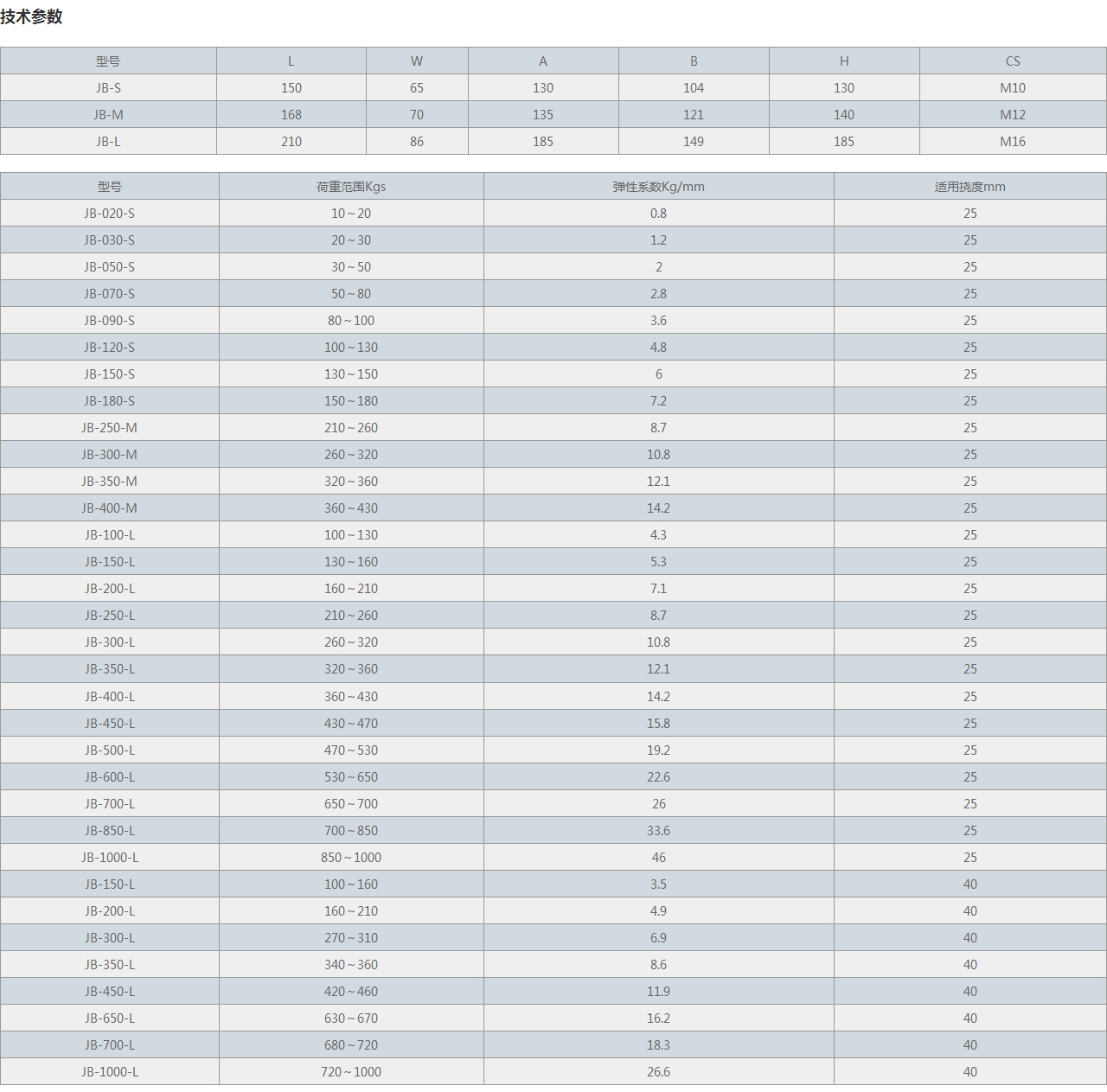 | 型號 | 荷重范圍Kgs | 彈性系數(shù)Kg/mm | 適用撓度mm |