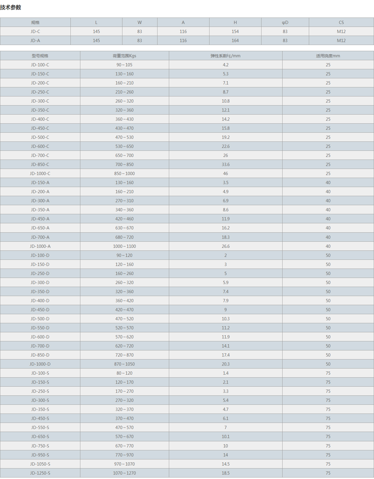 | 型號規(guī)格 | 荷重范圍Kgs | 彈性系數(shù)㎏/mm | 適用撓度mm |
