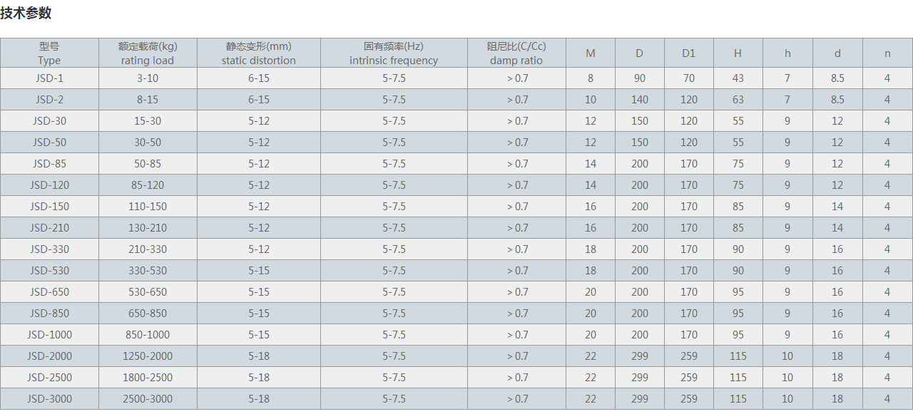 JSD型低頻橡膠隔振器等頻性好,當大于額定載荷后,隔振器的固有頻率保持不變;阻尼比大,對共振峰的抑制能力強;結(jié)構(gòu)簡單、安裝方便,可直接安裝在機座下,同時也可用地基螺栓固定安裝,使用安全可靠。十四種規(guī)格,六種外形尺寸,載荷范圍為30N~25000N,耐油、海水、鹽、霧禾口日照等,適用于一25~+117℃溫度范圍。載荷范圍為額定載荷上下50%。