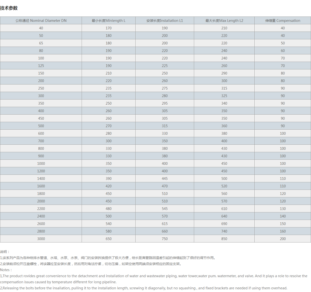 | 公稱通徑 Nominal Diameter DN | 很小長(zhǎng)度Minlength L | 安裝長(zhǎng)度Installation L1 | 很大長(zhǎng)度Max Length L2 | 伸縮量 Compensation |