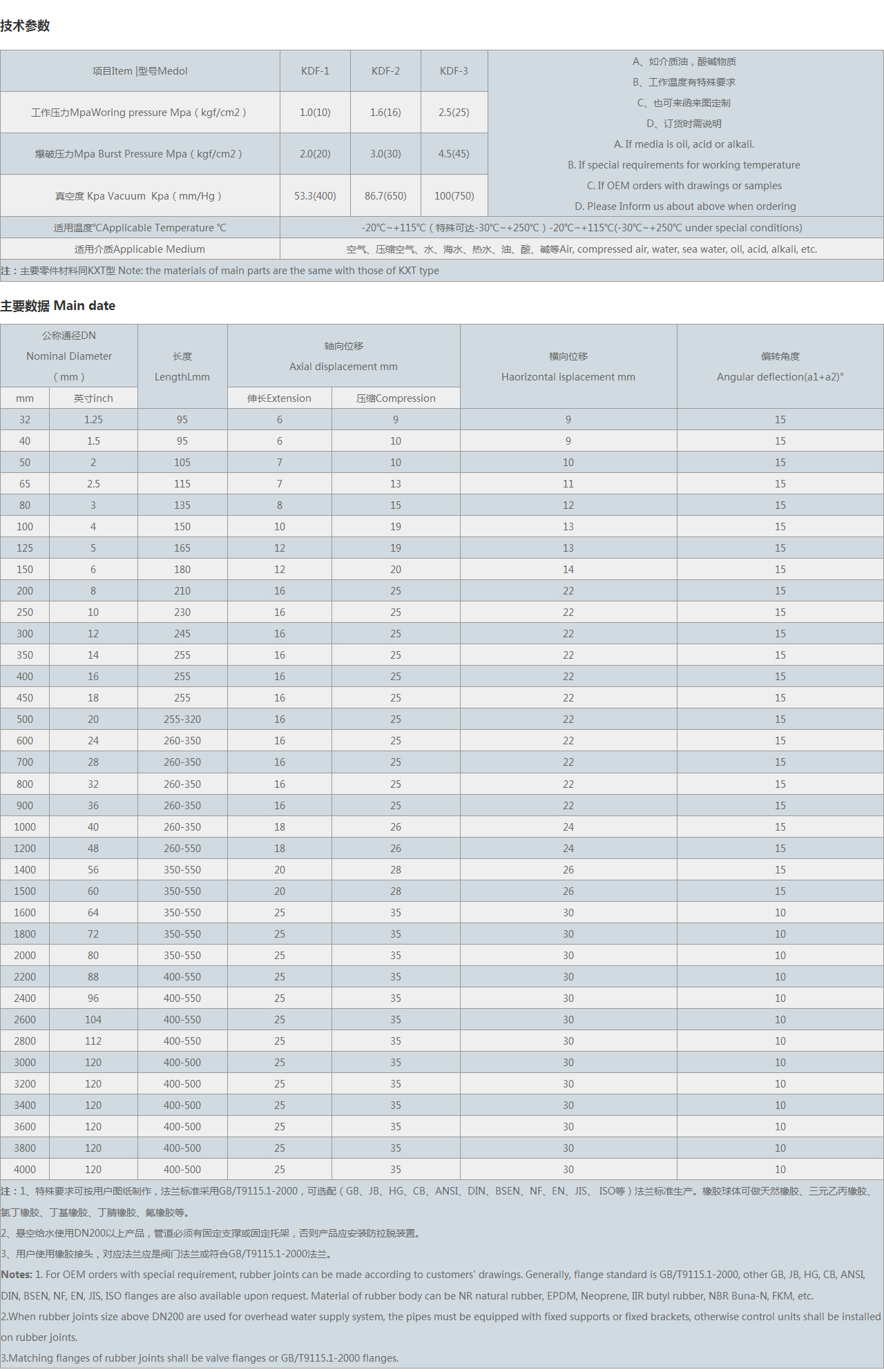 KDF翻邊型橡膠接頭是一種高彈性、高氣密性、耐介質(zhì)性和耐氣候性的管道接頭。由于可曲撓橡膠軟接頭有良好的綜合性能,主要用于原水和污水的提升和輸送,火力發(fā)電廠的給水和冷卻循環(huán)水,冶金行業(yè),冷凝水,化工行業(yè)的化學物質(zhì)的管道輸送,石化行業(yè)的冷卻,稀釋及其它行業(yè)長短距離管線間的柔性連接。因為橡膠具有較高的耐磨性,還適用于一切行業(yè)的粒狀和粉狀及汽體的輸送。