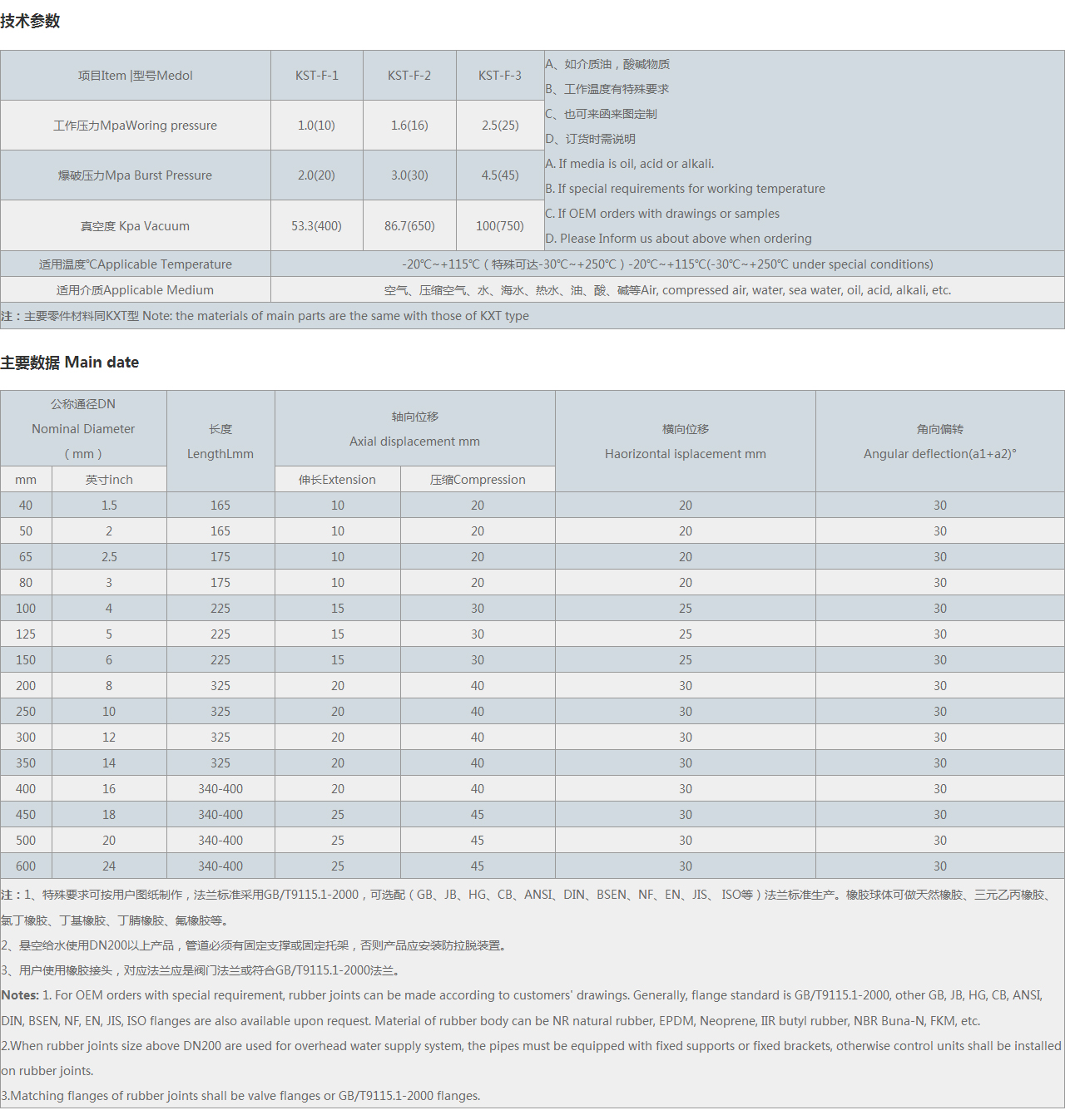 | 注:1、特殊要求可按用戶圖紙制作,可選配(GB、JB、HG、CB、ANSI、DIN、BSEN、NF、EN、JIS、 等)法蘭標準生產(chǎn)。橡膠球體可做天然橡膠、三元乙丙橡膠、氯丁橡膠、丁基橡膠、丁腈橡膠、氟橡膠等。 2、懸空給水使用DN200以上產(chǎn)品,管道必須有固定支撐或固定托架,否則產(chǎn)品應(yīng)安裝防拉脫裝置。 3、用戶使用橡膠接頭,對應(yīng)法蘭應(yīng)是閥門法蘭。 Notes: 1. For OEM orders with special requirement, rubber joints can be made according to customers' drawings. Generally, flange standard is , other GB, JB, HG, CB, ANSI, DIN, BSEN, NF, EN, JIS, flanges are also available upon request. Material of rubber body can be NR natural rubber, EPDM, Neoprene, IIR butyl rubber, NBR Buna-N, FKM, etc. 2.When rubber joints size above DN200 are used for overhead water supply system, the pipes must be equipped with fixed supports or fixed brackets, otherwise control units shall be installed on rubber joints. 3.Matching flanges of rubber joints shall be valve flanges or flanges. |