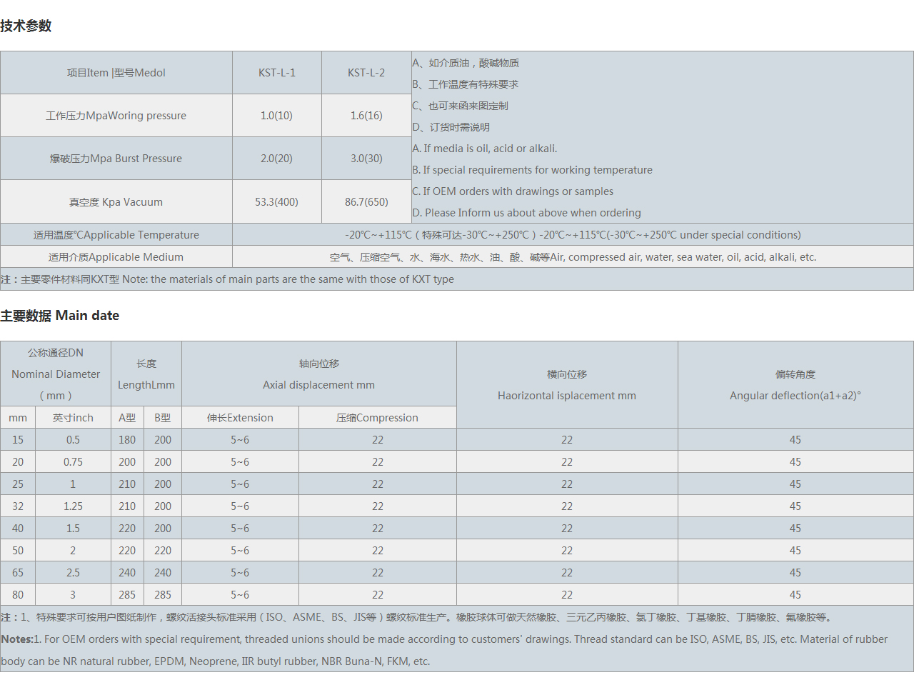 | 注:1、特殊要求可按用戶圖紙制作,螺紋活接頭標(biāo)準(zhǔn)采用(、ASME、BS、JIS等)螺紋標(biāo)準(zhǔn)生產(chǎn)。橡膠球體可做天然橡膠、三元乙丙橡膠、氯丁橡膠、丁基橡膠、丁腈橡膠、氟橡膠等。 Notes:1. For OEM orders with special requirement, threaded unions should be made according to customers' drawings. Thread standard can be , ASME, BS, JIS, etc. Material of rubber body can be NR natural rubber, EPDM, Neoprene, IIR butyl rubber, NBR Buna-N, FKM, etc. |
